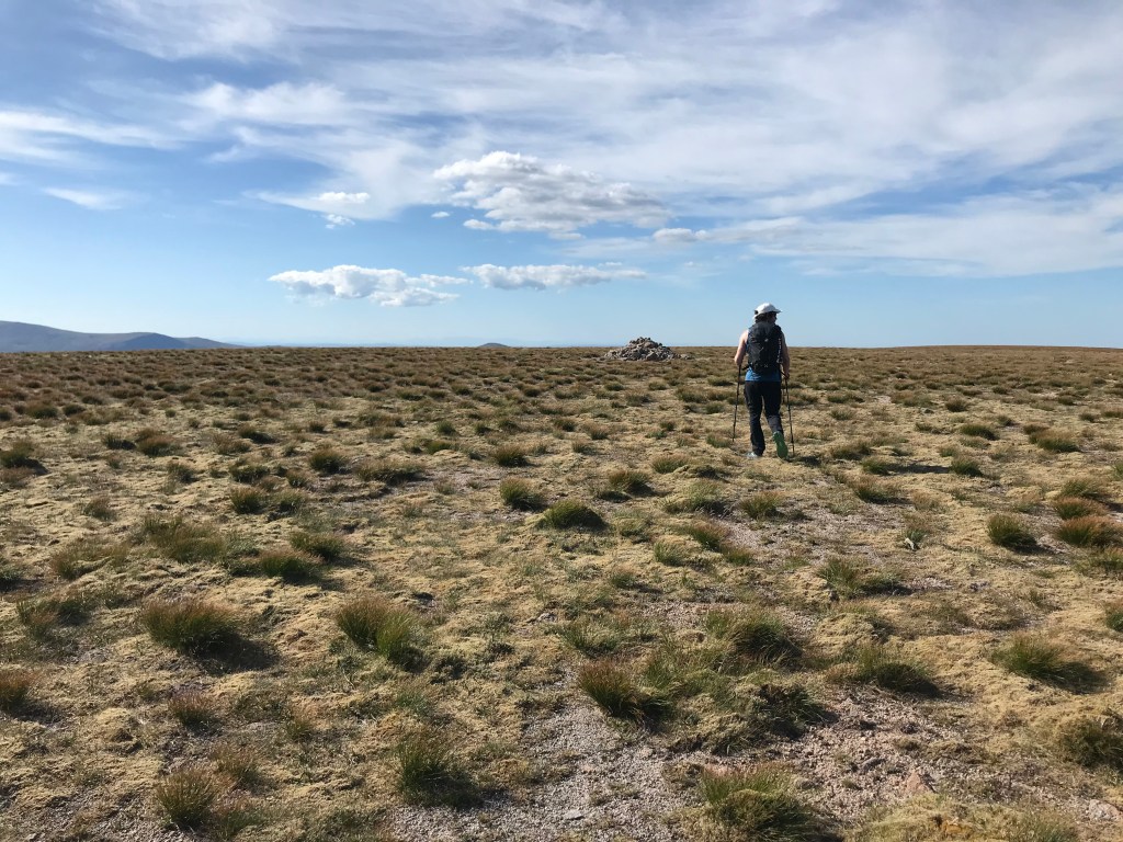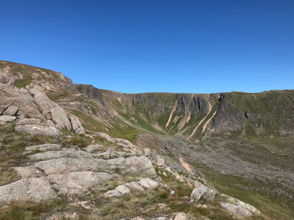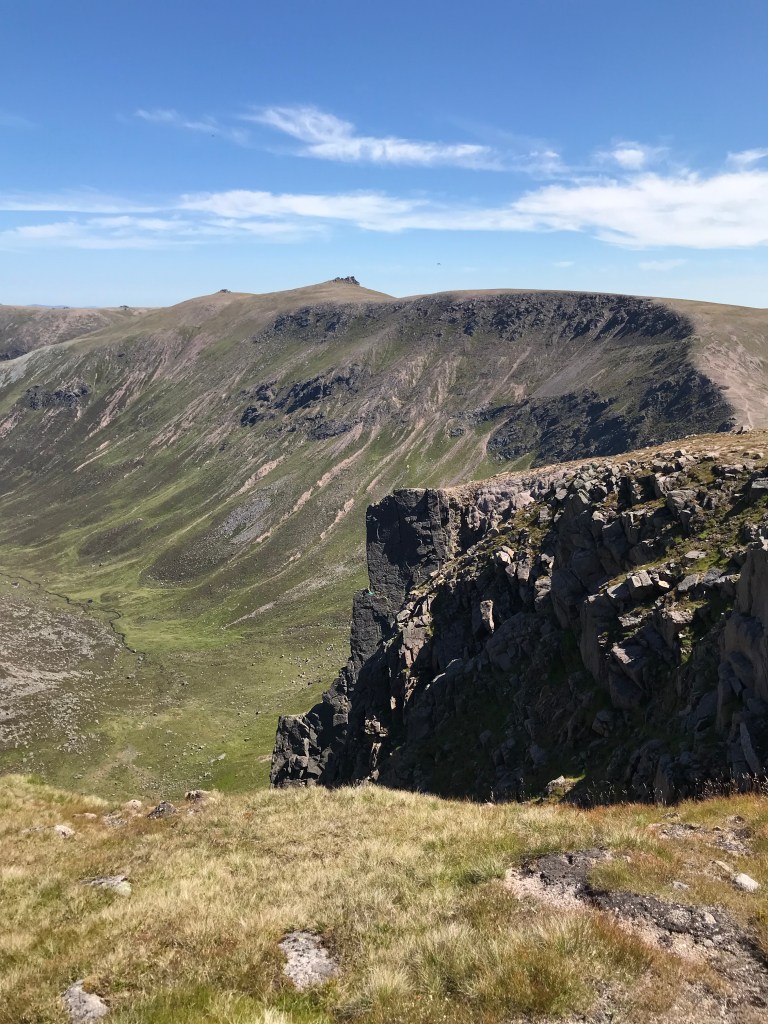 After a rest we drop back down and climb the Cumming-Crofton route, which is slightly harder and more enclosed by the rock. Then, having come all this way, it would be a real shame not to visit the summit, even if for me it’s a repeat visit. The plateau on Beinn a Bhuird is vast , and the corries which cut into it so extensive that the south summit, a top which I must leave till another day look like they are on a different mountain. The summit cairn itself feels nondescript located well back from any features and just surrounded by a vast openness.
