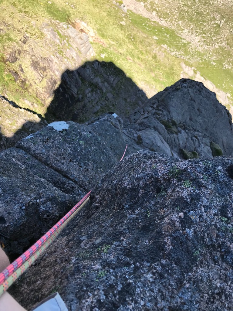 Not having lead outside, or even climbed much on rock since before the pandemic I’m a bit nervous as I set off up the first pitch. It’s like I half know what I’m doing but the intricacies of finding protection, thinking about rope drag, and spotting the holds has drifted into an archive somewhere in my brain that is not super quick to re-grant access again. The pitch however offers plenty of opportunity to refresh my memory with nuts, cams and a good sling placed. It’s the least delicate and photogenic pitch of the three but I arrive on the belay to a great view out across the the corrie.