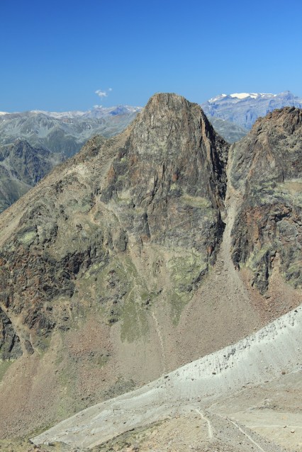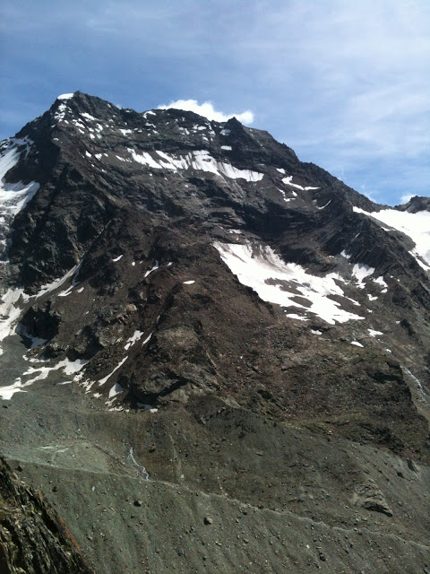 The summit of the Jägihorn is a terrific viewpoint especially across to the high peaks of the Michabel chain on the far side of the valley including tomorrows target the Allinhorn, but conscious of a rocky decent and the looming cut off time of the last bin back to the valley the summit moment is a little rushed.