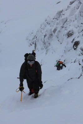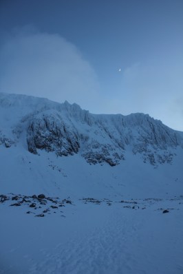 Carrying skis for the first time does not prove to be much of a chore, the weight being very similar to carrying a rope and climbing equipment if we were going to do a harder route. My ski books are designed for touring so are actually very comfortable to walk in, weighing little more than my normal winter boots, plus they are plastic keeping my feet nice and snug. After about an hour the cliffs of Sneachda rear up out of the mist a colossal castle of black ramparts and battlements. At the base of the face we get kitted up have a bite to eat and dig a few test pits in the deep snow below our route of choice, Aladdin’s Coulior a wide snow gully that cuts up behind the buttress.