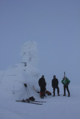 Emerging onto the plateau we become aware of the wind as I feel the gusts catching the skis which are strapped to my rucksack, trying to twist me sideways. With visibility now down to about twenty meters out come the map and compass to get us up to the summit through this world of white. Whilst walking I notice a subtle change in colour parallel to us and out to our left; the snow changing from matt white to a dull grey. I then realise the grey is not snow but empty space, the cornice at the edge of the plateau which we have manage to get to within about seven meters of it before seeing it. It’s a stark lesson in the importance of understanding where you are and all too easy to see how people fall through cornices in really bad visibility.
