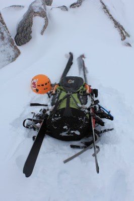 There has been quite a bit of snow the last few days and the avalanche forecast for the gullies is medium to high, the lower section of the gully is quite scoured out by the wind but snow has banked out higher up and I stop about every thirty meters or so to dig a test pit. The fresh snow appears quite well bonded to to hardend lower layers and none of the pits fail along obvious cleavage planes. To be on the safe side we stick to the edge of the gully close to the rocks where the snow should be better bonded anyway. [With 2016 eyes I’m not sure we made a good call here and probably should have stayed out the gully].