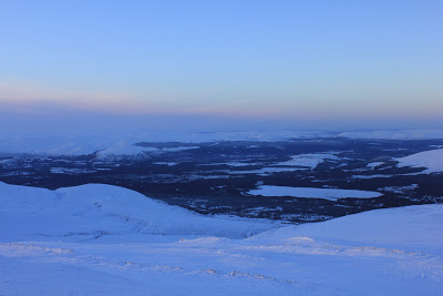 Carving down on the baring (or rather trying to keep up with Sarah) I suddenly drop out of the cloud and spot the top of the ski lifts in the distance. In the evening light the view out over the valley is terrific with a series of smaller hills stretching north towards Inverness and a frozen Loch Morlich nestled in its cocoon or woodland. From the summit station it takes less then fifteen minutes to carve our way down the mountain and loose the height it took us three hours of hard work to gain this morning. Ski mountaineering I’m sold.