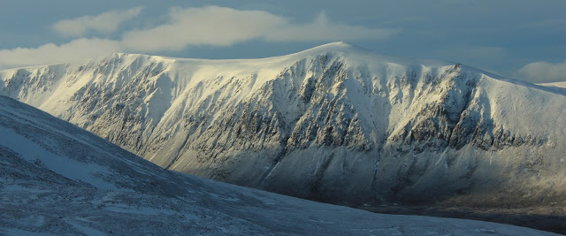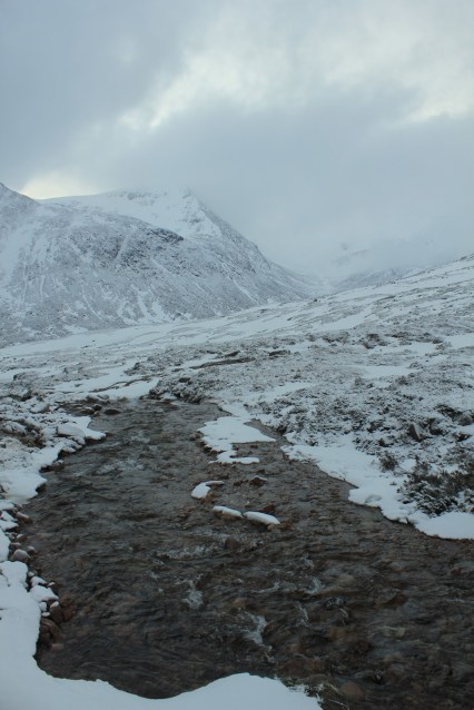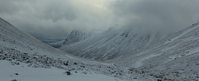 In the foot of the valley we breifly follow the stream uphill allong the floor of the ravine until it disappears underground bubbling out of a jumble of boulders. Soon after this a path breaks of right and begins the long climb onto the mountain whilst offering spectacular view over towards Glen Eanaich and a snow draped Sgor Gaoaith. By the time we reach the shoulder of Sron na Lairige the forcast has gone well out the window; cloud rolling in from the south envelopes us and the wind picks up whipping the warmth from any exposed skin.