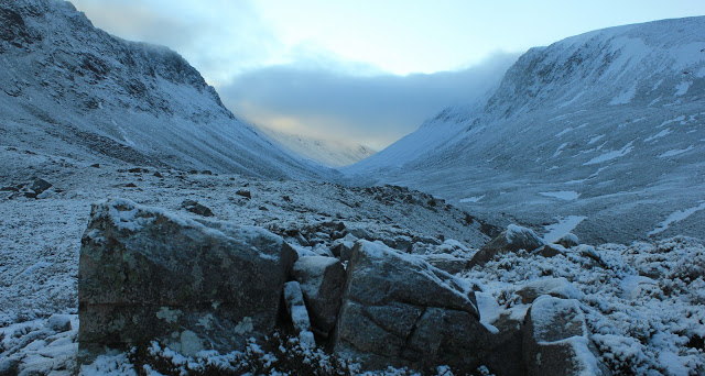 The Chalamain gap is a chaotic jumble of boulders cast haphazardly against each other choking the deep narrow notch between Lurchers Crag and Creag Chalamain. Moving through them is a constant full body experiance weaving left and right climbing up and down, a hand hold here a knee used there. The powder decorating the boulders hides some of the gaps creating a trap for the poorly placed foot.