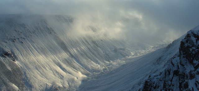 An Garbh Coire is renown for collecting vast quantities of snow blown in off the high plateau to the west. Here many snow patches will last well into summer and in some of the sheltered corners high up in the coire the snow has only melted five times in the last hundred years. The wind blown snow also creates cornices of stupendous size. It also contains Coire na Lochain Uaine hanging above the main coire seemingly almost inaccessible from below protected by incredibly steep slopes.
