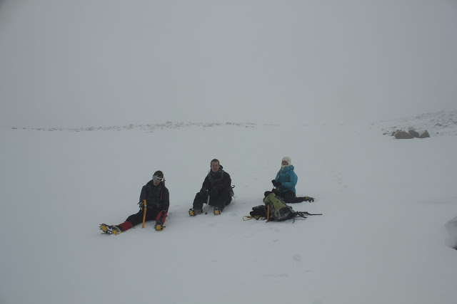 Shortly before the summit I get my first experience of a full complete whiteout; snow and sky blend seamlessly together cloaking us in all directions with not a single speck of black or colour to indicate up from down, or north from south. Thoughts of the of the great cliffs and possible monster cornices off somewhere to our left stir uneasily in my mind but after a short bit of compass work we see boulders agin poking up through the snow and later the summit cairn itself.