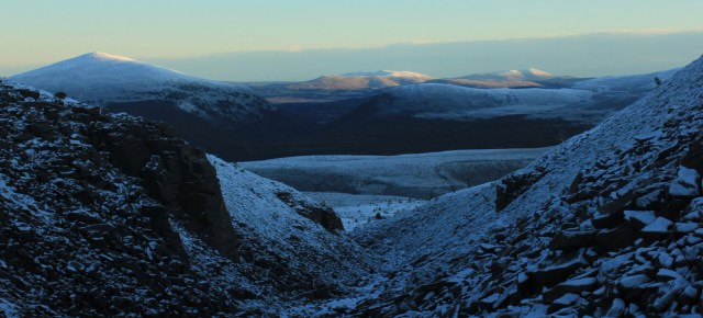 The morning is cold and clear with a light dusting of snow covering the heather as we follow a good path gently rising across the mountainside towards the Chalamain Gap. The coires of Sneachda and Lochain, winter playground of countless climbers appear stark against the southern skyline, buttresses black and stark against the white snow filling the gullies.