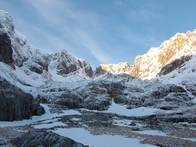 Decision made we began the ritual of the long drive up from the south, the familiar places we pass through, brooding snow caped hills, and the magnificent stretch of road between Tyndrum and Ballachulish heightening anticipation and a good deal of nervousness on my part at least. Arriving at the north face car park a little after twelve we meet a French party who have just come down off the hill. A quick chat as we put our rucksacks in order confirms that Orion looked in good nick, they themselves having had a great day on Galactic Hitchhiker.